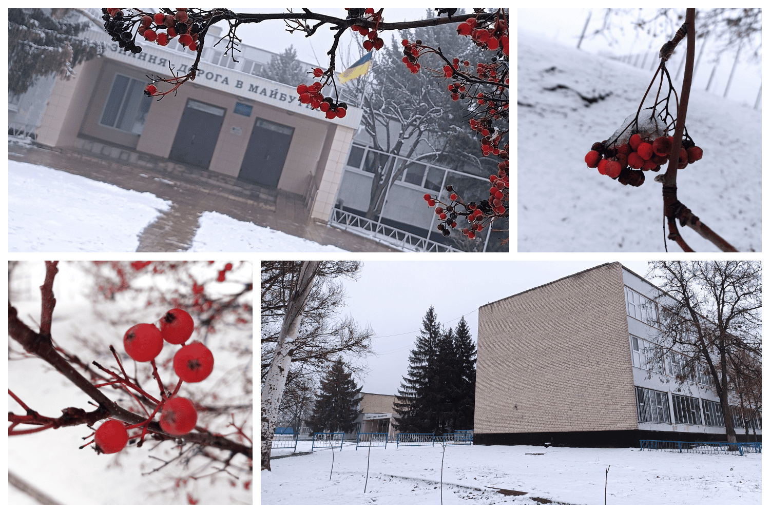 Шкільне подвір’я в білім серпанку.Червоні кетяги горобини.Палають теплом у зимовім ранку.Снігом укриті стежки й двори,Тиша навколо — мов подих казки.Ліцей стоїть, мов надій оберіг,Під небом …