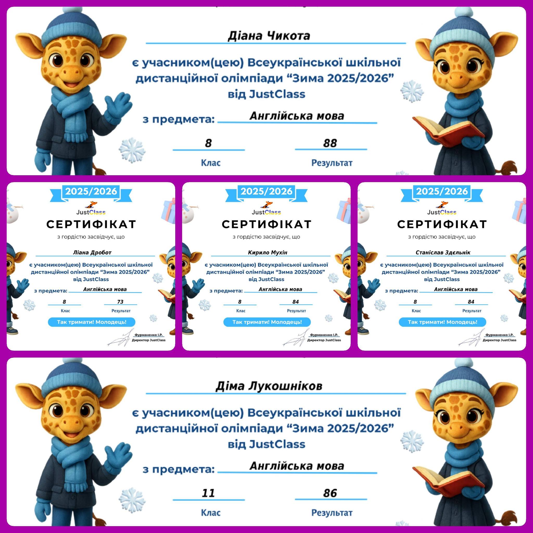 Здобувачі освіти Барвінківського ліцею №1 взяли активну участь у Всеукраїнській шкільній дистанційній олімпіаді з англійської мови «Зима-2025/2026» від JustClass (вчитель – Пересада Р.В.). Сертифікати переможців отримали: Колісник Олександр, Сердюк Іван, Чернявська Єлизавета, Ковальова Поліна (10-Б клас), Хлудов Дмитро (9-А клас), Здєльнік Станіслав, Мухін Кирило, Чикота Діана, Дробот Ліана (8-Б клас). Побажаємо учням успіхів у навчанні та творчої наснаги!