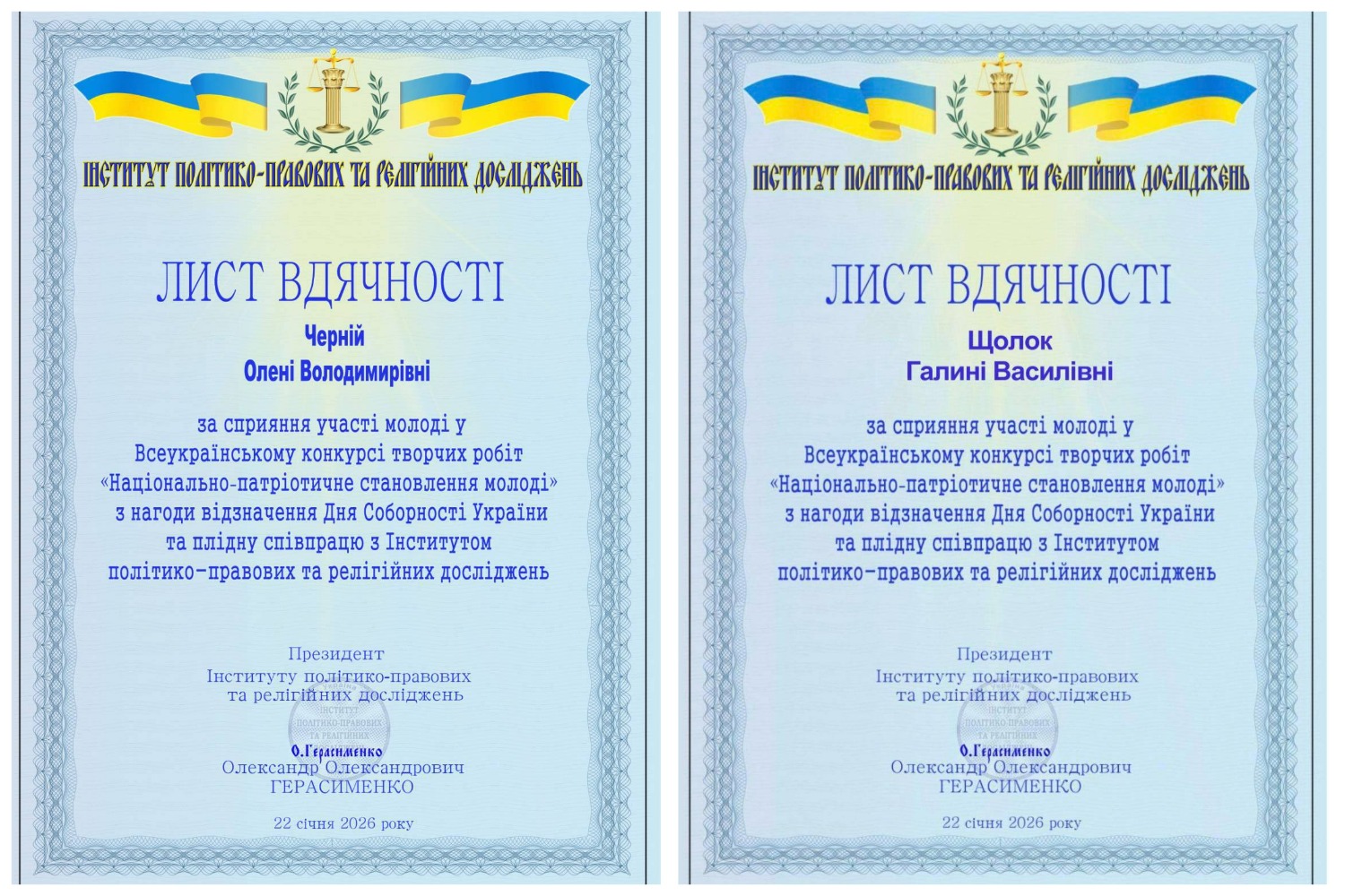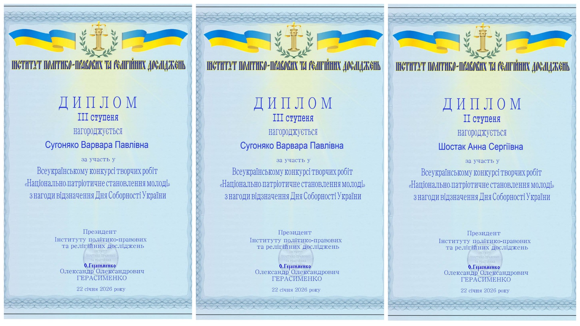 Дипломом ІІ ступеня відзначено роботи Анастасії Данильченко і Анни Шостак (учителька Олена Володимирівна Черна) та Дипломом ІІІ ступеня – робота Варвари Сугоняко (учителька Галина Василівна Щолок), учениць Барвінківського ліцею №1, які були представлені на Всеукраїнському конкурсі творчих робіт «Національно-патріотичне становлення молоді України», присвяченому Дню Соборності України. На конкурс було представлено 25 368 творів-есе. Наші здобувачки освіти показали неймовірні результати!!! Навіть у такому щільному колі конкуренції серед учнів, студентів технікумів, колегіумів, ЗВО з усіх регіонів України роботи дев’ятикласниць – у числі переможців!