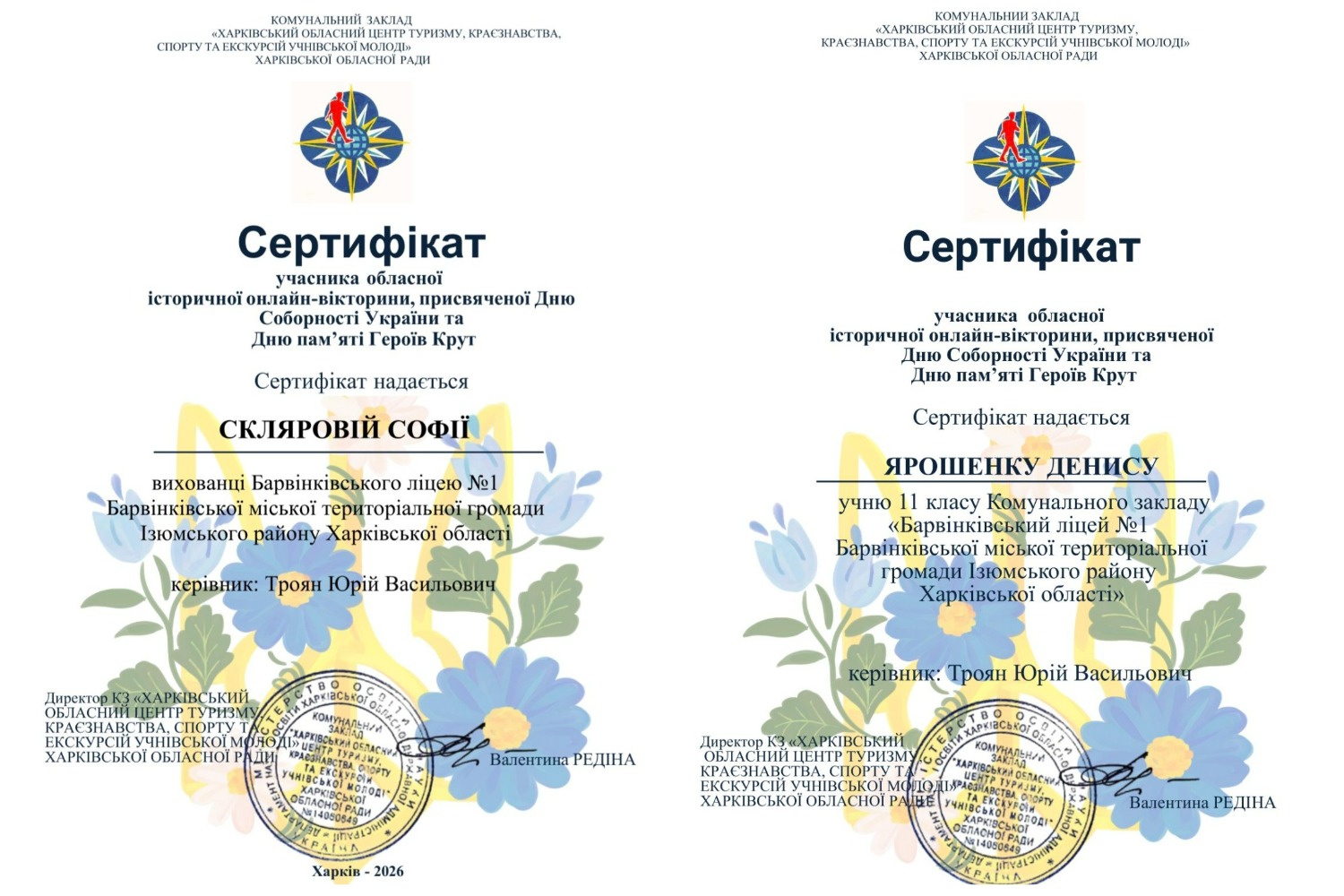 Вітаємо переможців історичної онлайн-вікторини, присвяченої Дню Соборності України та Дню пам’яті Героїв Крут. У вікторині, організатором якої став Комунальний заклад «Харківський обласний центр туризму, краєзнавства, спорту та екскурсій учнівської молоді» Харківської обласної ради, взяли участь 618 вихованці закладів освіти усіх районів Харківської області.